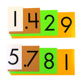 The cards are all 4” high and range in length from 2.5” to 10” depending on place value. Each set is packaged in a re-sealable bag for easy storage. 10 each of 4 values: thousandths, hundredths, tenths, ones. 40 cards total.