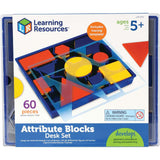 Teach shapes, sorting, patterns, size, and counting with these durable plastic blocks. 60 piece set includes 5 shapes, 2 sizes, 2 thicknesses and 3 colors. Set comes in a convenient storage tray with shape sorter that can be used for tracing. Grades Kindergarten +.