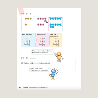 The Student Book is the consumable textbook of the program.Chapters and daily lessons are based on the Readiness-Engagement-Mastery model of learning used in Singapore classrooms. In the Readiness phase, students make connections to previously learned concepts and skills to be sure they have the base knowledge to succeed with learning goals. In the Engagement phase, students learn by doing and construct new knowledge through engaging activities and guided inquiry. In the Mastery phase, students gain fluency, confidence, and deeper conceptual understanding through practice and problem solving.