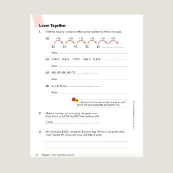 The Student Book is the consumable textbook of the program.Chapters and daily lessons are based on the Readiness-Engagement-Mastery model of learning used in Singapore classrooms. In the Readiness phase, students make connections to previously learned concepts and skills to be sure they have the base knowledge to succeed with learning goals. In the Engagement phase, students learn by doing and construct new knowledge through engaging activities and guided inquiry. In the Mastery phase, students gain fluency, confidence, and deeper conceptual understanding through practice and problem solving.