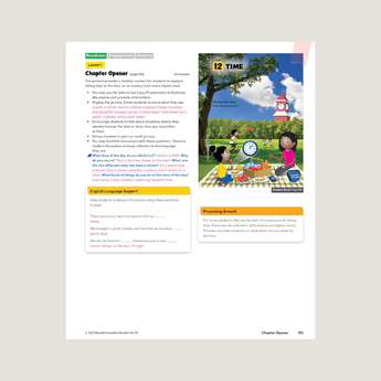 The Teacher’s Guide provides teaching ideas and strategies to facilitate exploration, classroom discussion, and student-centered learning. It also includes ideas for differentiation, ideas for small group learning, and answers with select worked solutions. The front matter provides background on the program structure, lesson and concept development, and an overview of the Readiness-Engagement-Mastery model of learning.