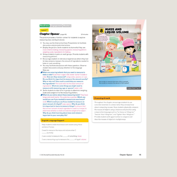 The Teacher’s Guide provides teaching ideas and strategies to facilitate exploration, classroom discussion, and student-centered learning. It also includes ideas for differentiation, ideas for small group learning, and answers with select worked solutions. The front matter provides background on the program structure, lesson and concept development, and an overview of the Readiness-Engagement-Mastery model of learning.