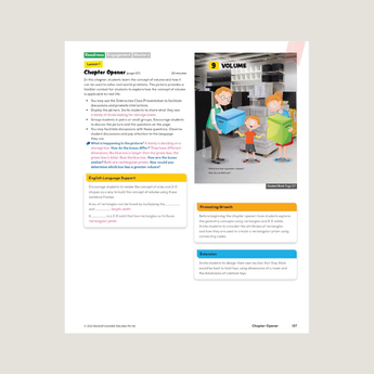 The Teacher’s Guide provides teaching ideas and strategies to facilitate exploration, classroom discussion, and student-centered learning. It also includes ideas for differentiation, ideas for small group learning, and answers with select worked solutions. The front matter provides background on the program structure, lesson and concept development, and an overview of the Readiness-Engagement-Mastery model of learning.
