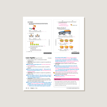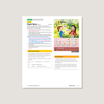 The Teacher’s Guide provides teaching ideas and strategies to facilitate exploration, classroom discussion, and student-centered learning. It also includes ideas for differentiation, ideas for small group learning, and answers with select worked solutions. The front matter provides background on the program structure, lesson and concept development, and an overview of the Readiness-Engagement-Mastery model of learning.