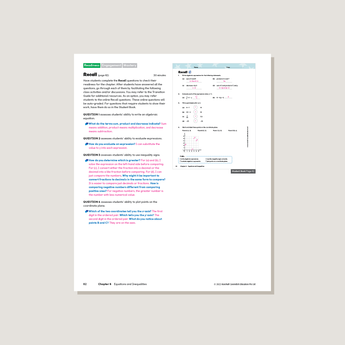 The Teacher’s Guide provides teaching ideas and strategies to facilitate exploration, classroom discussion, and student-centered learning. It also includes ideas for differentiation, ideas for small group learning, and answers with select worked solutions. The front matter provides background on the program structure, lesson and concept development, and an overview of the Readiness-Engagement-Mastery model of learning.