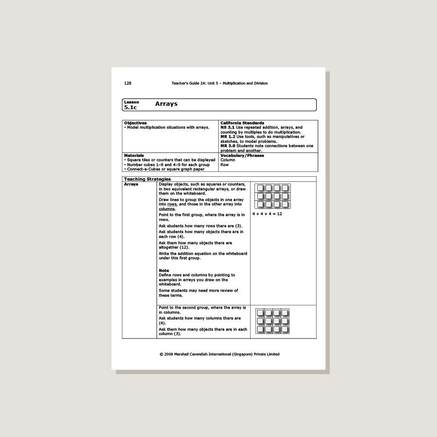 Primary Mathematics Standards Edition Teacher's Guides are designed to help teachers understand the course material and prepare for the day's lessons. Rewritten specifically for the Standards Edition, the lessons have been developed according to the approach and methodology central to this series. Detailed, step-by-step lesson plans and introductory content are provided to assist teachers in using the Primary Mathematics Standards Edition program.
