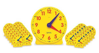 Get the whole class involved in time-telling activities. Kit includes one 13 1/4" Big Time 12-Hour Demonstration Clock, twenty-four 4" geared mini-clocks, and a Teaching Guide.